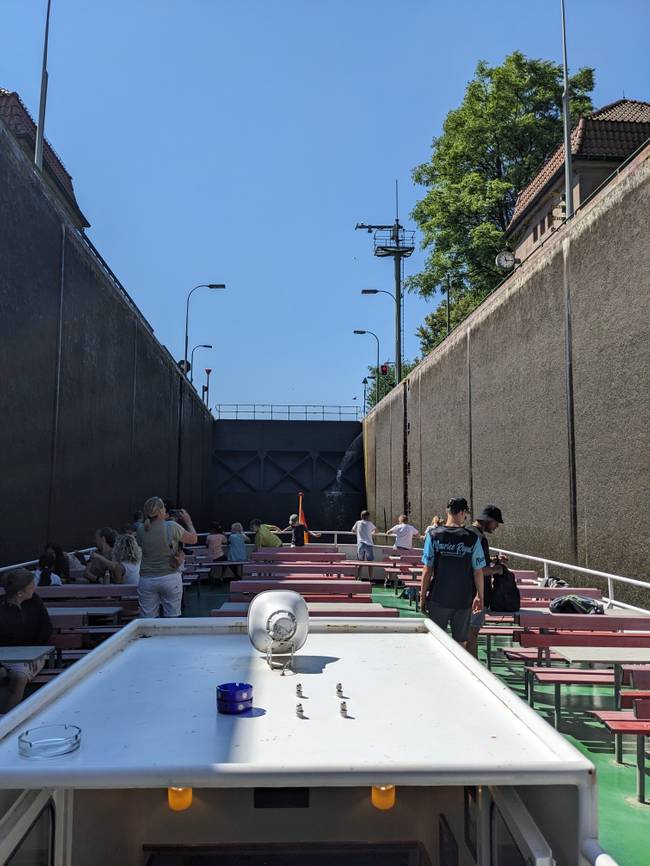 Schachtschleuse Minden - Die von 1911 bis 1915 gebaute Schachtschleuse in Minden liegt im Abstieg vom Mittellandkanal zur Weser. Ihr Standort wurde unmittelbar westlich der Kanalbrücke unterhalb der letztlich in den Bau einbezogenen natürlichen Flussterrasse gewählt, um ein direktes Wechseln der Schiffe zwischen Kanal und Weser zu ermöglichen. Die Schachtschleuse wurde mit der ausgereiften und ästhetisch aufbereiteten Technik bis heute zum Mittelpunkt touristischen Interesses.