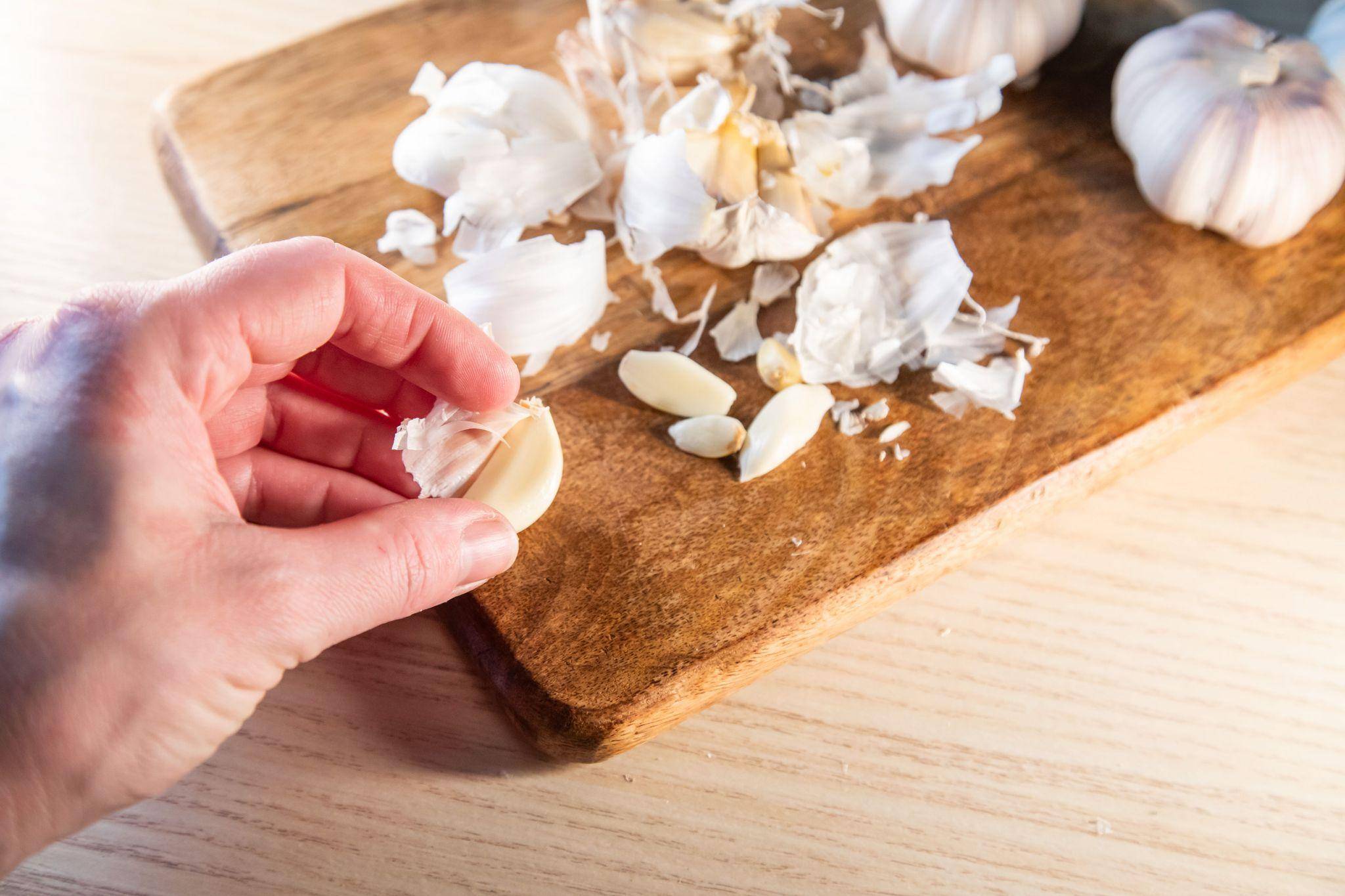 Und so geht`s: Den Knoblauch oder einzelne Zehen ungeschält für etwa 15 Sekunden in die Mikrowelle legen. Anschließend die Schale mit den Fingern abziehen.